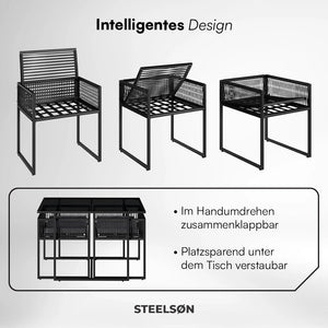 Das dreiteilige Gartenmöbel-Set 'Kynaris' von STEELSØN bietet eine clevere Aufbewahrungsmöglichkeit: Die Stühle lassen sich einfach zurückklappen, das Kissen auf der Rückseite verstauen und bequem unter den Tisch schieben. So bleibt Ihre Terrasse oder Ihr Balkon stets aufgeräumt und stilvoll.