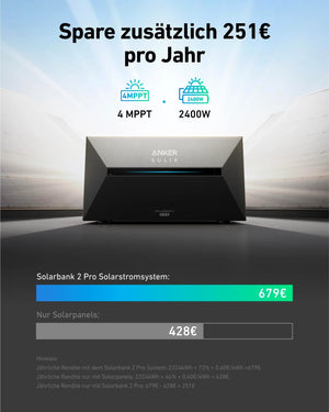 JÄHRLICH 251€ STROMKOSTEN GESPART: 4 MPPT-Routen unterstützen 2400W, und du kannst Erweiterungsakkus bis zu 9,6kWh Kapazität hinzufügen. All diese Energieeinsparungen führen zu einer massiven Reduzierung deiner Stromrechnung um bis zu 251€.