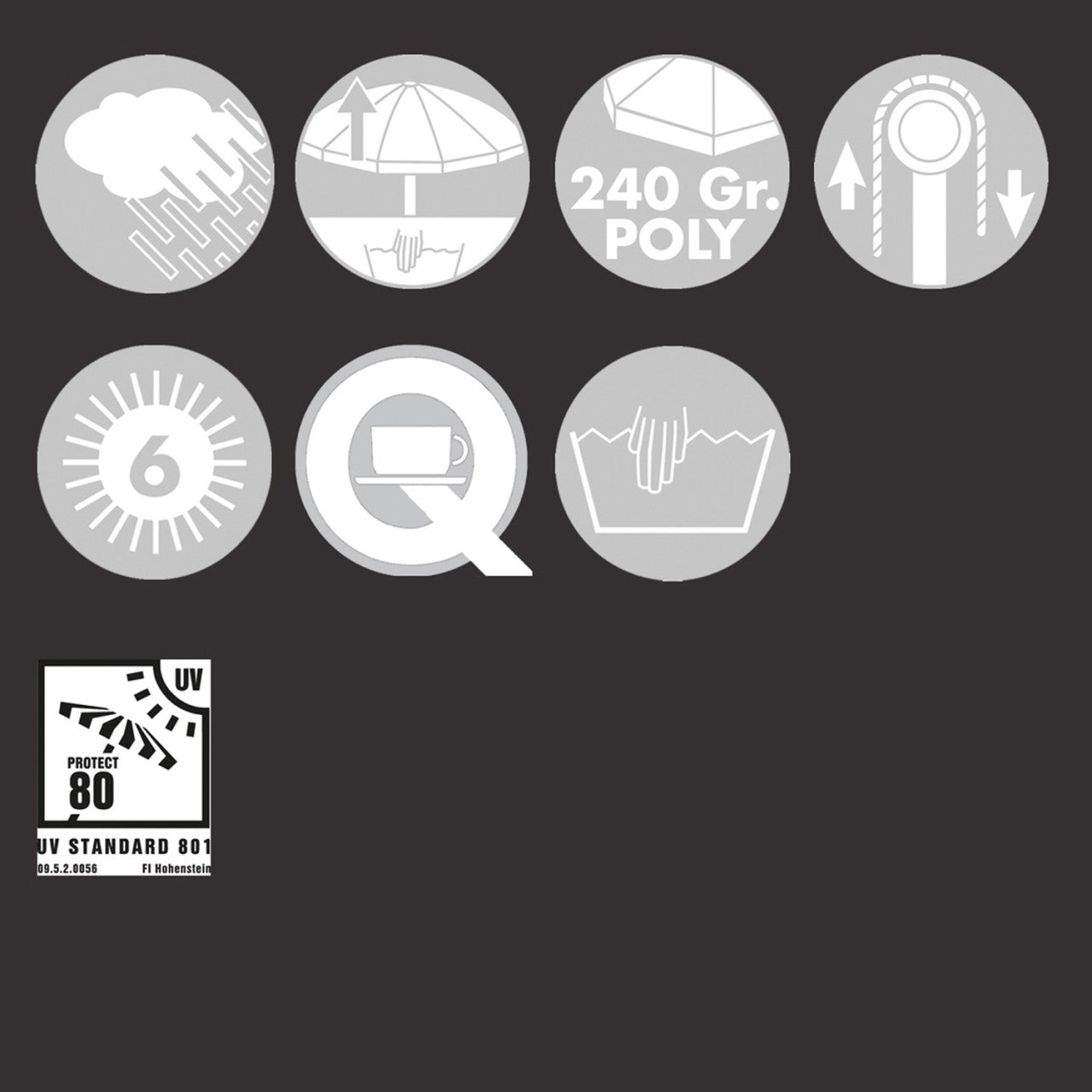 Der elegante Alupro-Stoff des Segels entspricht mit Lichtschutzfaktor 80 dem Standard von UV-Schutzkleidung und garantiert sorglose Entspannung im Freien.