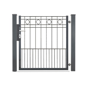 Das dz Flügeltor VARIO Residenz klassik TURIN wird als Komplettset mit stabilen Pfosten, Alutürgriff, Rohrrahmenschloss und verstellbaren Scharnieraufhängungen geliefert. Das Tor kann DIN links/rechts und Öffnungswinkel 90/180 Grad wahlweise vor Ort montiert werden. Ein hochwertiges Rohrrahmenschloss ist bereits vormontiert. Die Toraufhängung ist zweidimensional verstellbar.