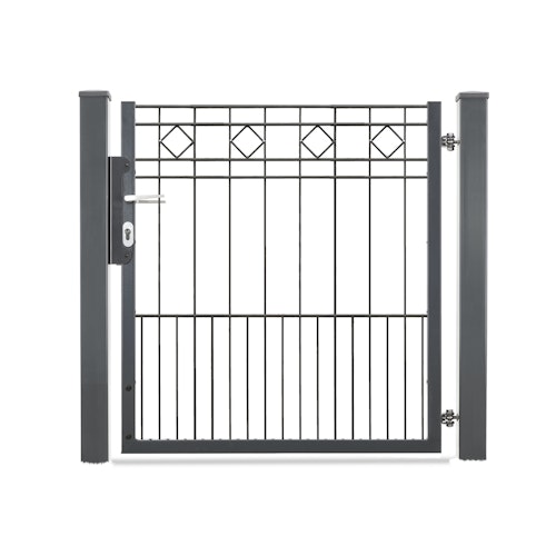 Für die Montage von Zaunfeldern an den Torpfosten wird das dz Montageset Pfosten benötigt. Ein Profilzylinder ist optional. Sie finden die Artikel im Reiter Zubehör.
