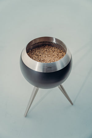Dabei sitzt die schwarze Stahlkugel sicher auf seinem erhöhten Edelstahlfuß und bietet beste Sicht auf das lodernde Feuer, das bei Verwendung von Pellets bis zu 2 Stunden ununterbrochen und ohne Nachlegen brennt.